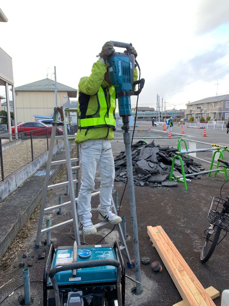 この現場では発電機と2台の杭打ち機をフル稼働して1000本以上の杭を打ち込んでおります。
